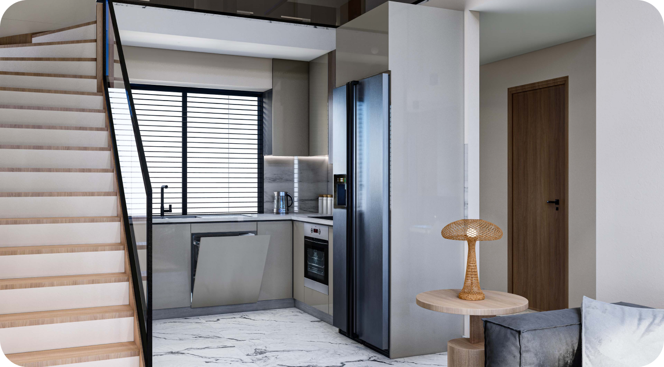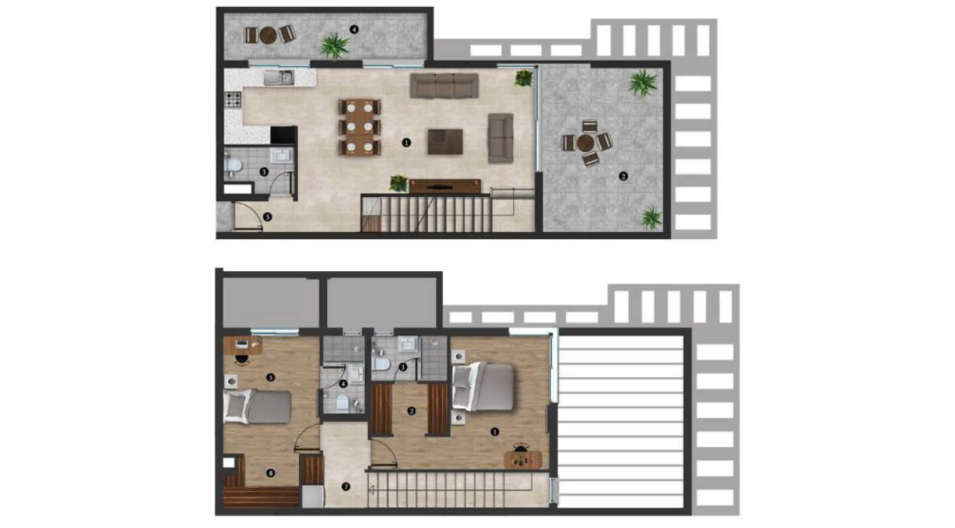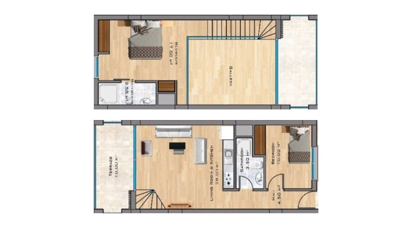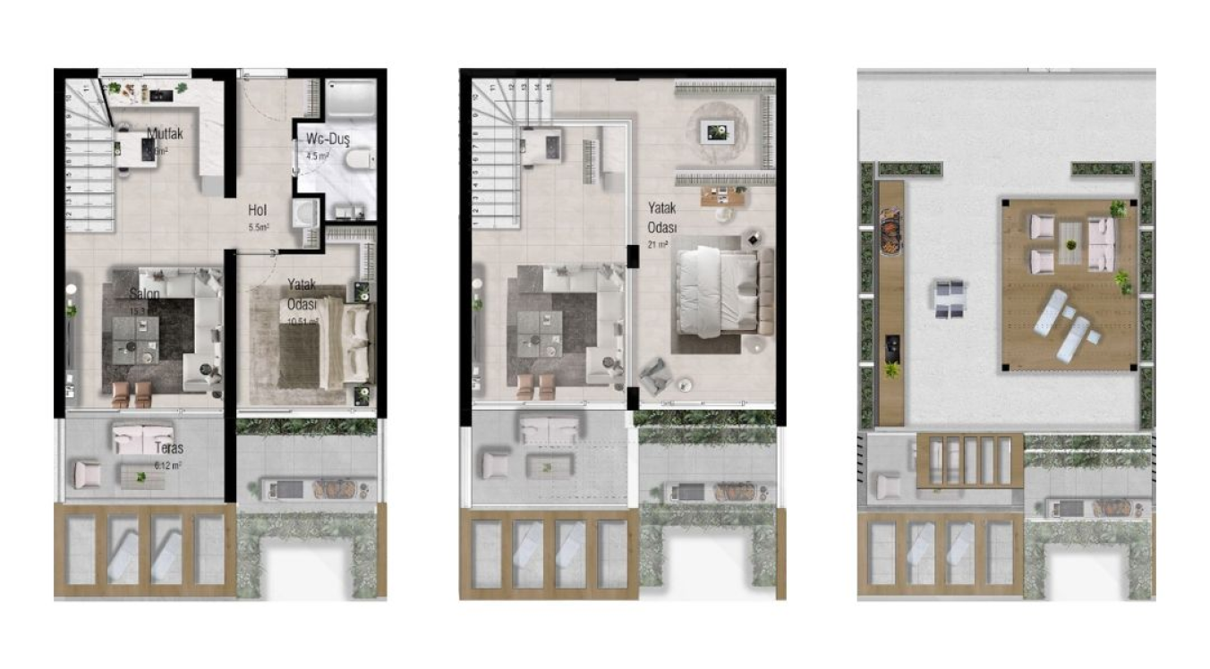Charakterystyka nieruchomości- Typ nieruchomości: 2+1 Loft Penthouse Powierzchnia: 73m² (balkon 6m² + taras na dachu 45m²) Odległość od morza: 350 m